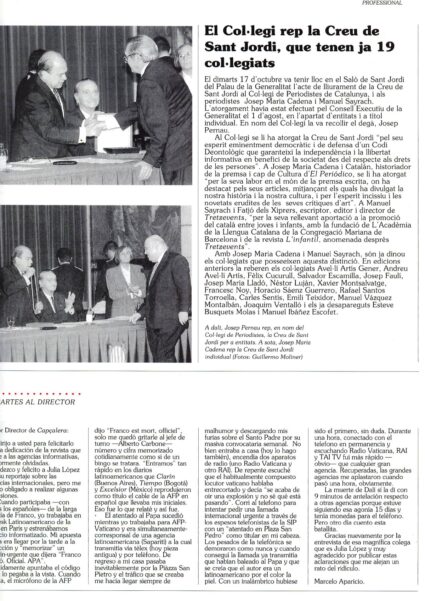 La Generalitat de Catalunya concedeix al Col·legi de Periodistes la Creu de Sant Jordi