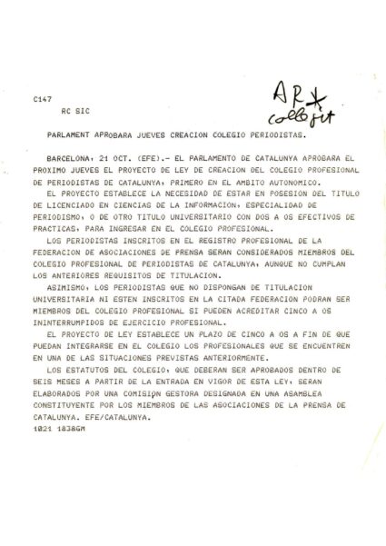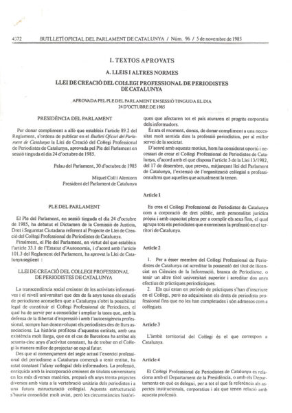 El 8 de novembre de 1985, el Parlament de Catalunya va aprovar la Llei 22/1985, que creava el Col·legi de Periodistes de Catalunya com a corporació de dret públic, amb personalitat jurídica pròpia i plena capacitat per complir els seus objectius. D’aquesta manera va néixer la primera organització professional de periodistes de referència per als periodistes a Catalunya, i la primera de tot l’Estat Espanyol.